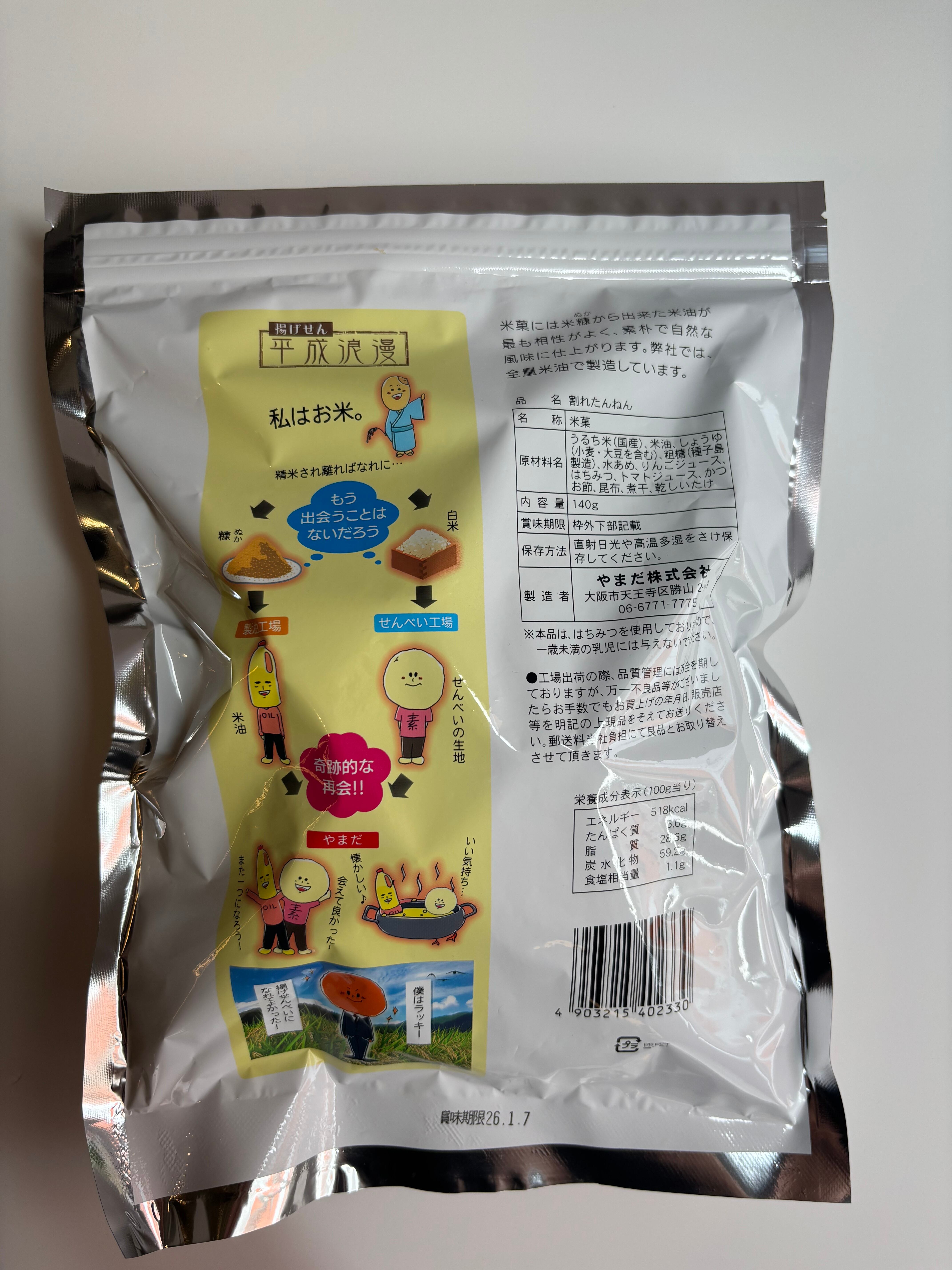 原材料:うるち米(国内産)、米油、醤油(大豆、小麦)、砂糖、水あめ、りんごジュース、はちみつ(国内産)、トマトジュース、鰹節、昆布、煮干、乾しいたけ
