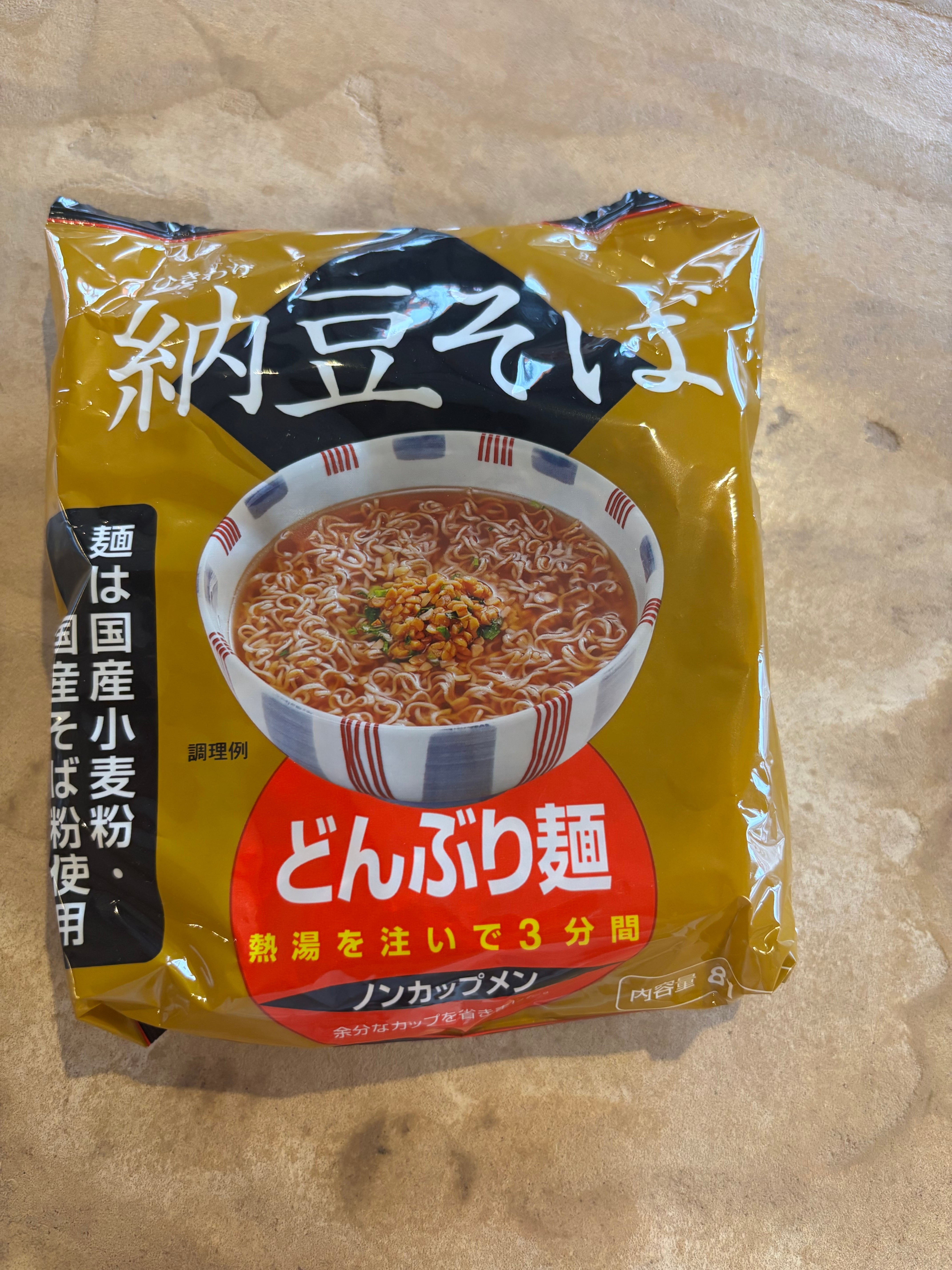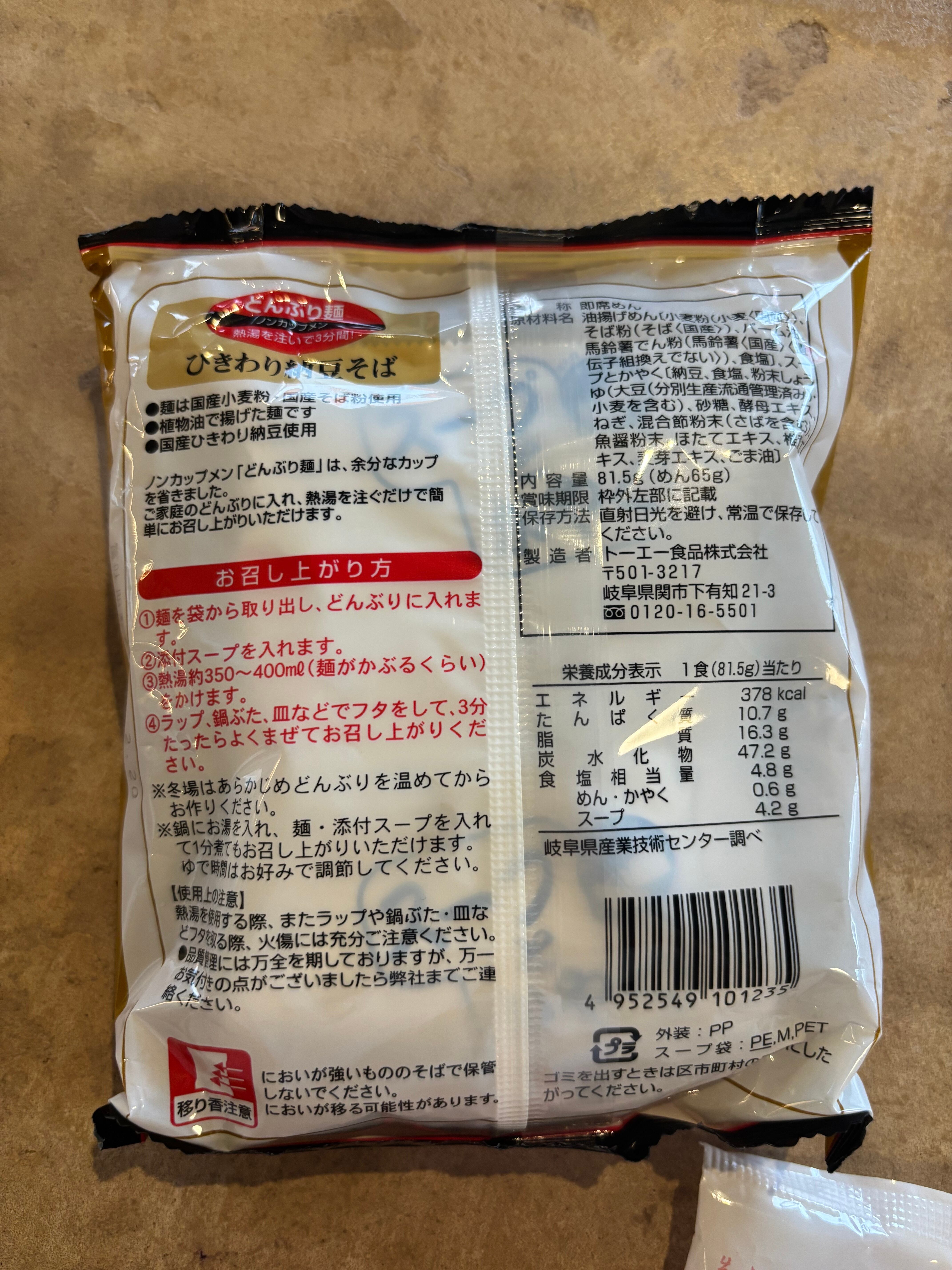 油揚げめん:小麦粉(国内産100%)、そば粉、パーム油、馬鈴薯でん粉(遺伝子組換えでない)、食塩 スープ:食塩、粉末醤油(大豆(遺伝子組換えでない)、小麦を含む)、砂糖、酵母エキス、混合節粉末(サバを含む)、魚醤粉末、ほたてエキス、椎茸エキス、麦芽エキス、ごま油 かやく:納豆、ねぎ