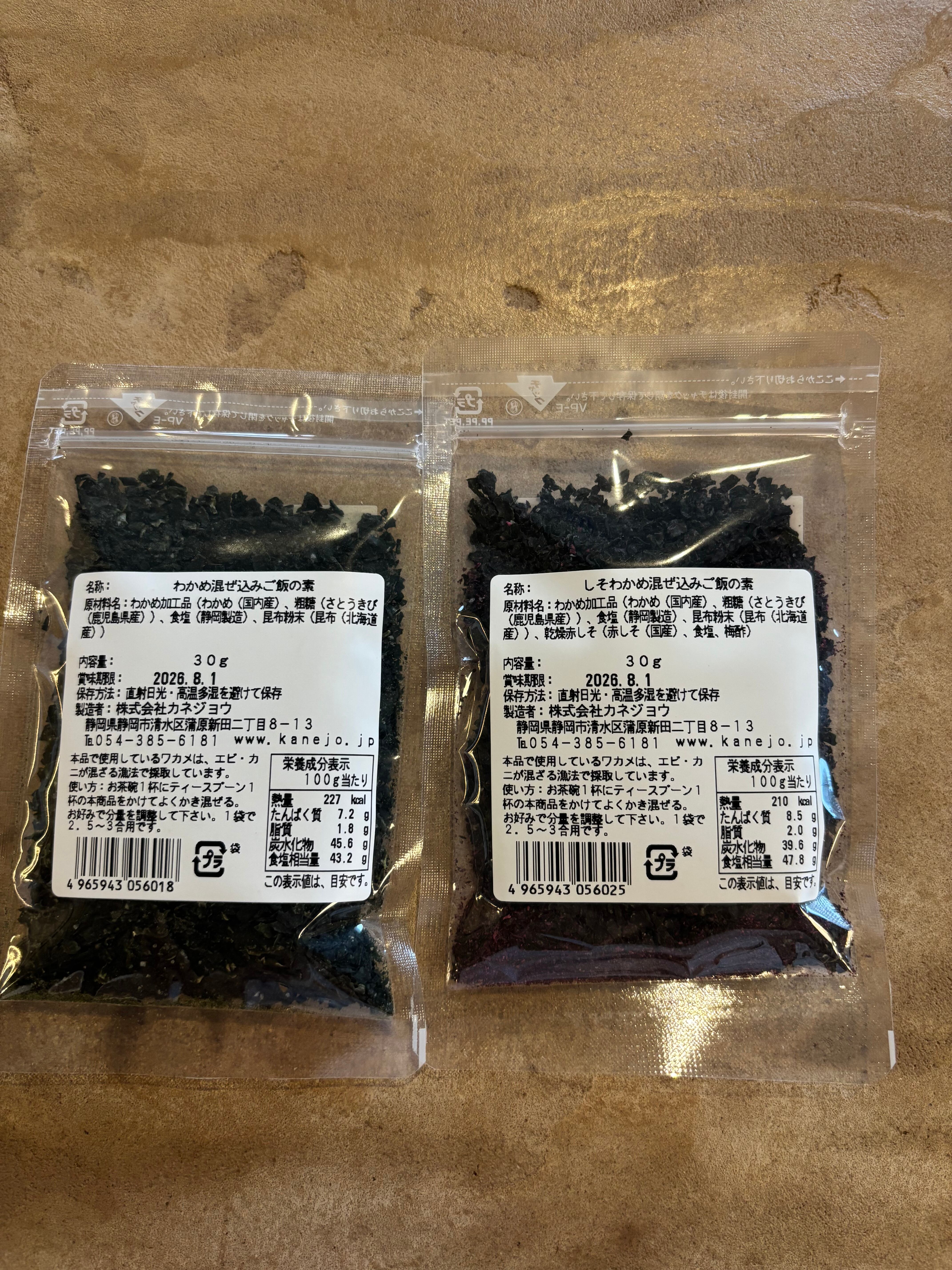 わかめ加工品(わかめ(国内産)、粗糖(鹿児島県産)、食塩(静岡製造)、昆布粉末(昆布(北海道産))、乾燥赤しそ(赤しそ(国産)、食塩、梅酢)